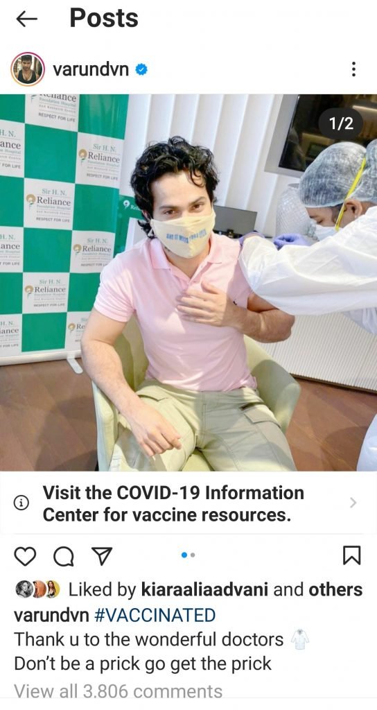 The bollywood star Varun Dhawan took to social media instagram and posted a post of getting vaccinated against Covid 19 and urged his fans to also go ahead and get vaccinated.