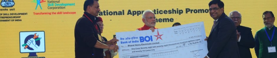 The Hon’ble Prime Minister, Sh. Narendra Modi, presented a cheque of the highest amount of Rs.1.79 Crore to Sh. Atul Sobti, CMD, BHEL, at the Kaushal Mahotsava in Kanpur, as a mark of appreciation for BHEL’s active participation by engaging a large number of apprentices across the country under the National Apprenticeship Promotion Scheme (NAPS), representing the organization’s contribution to the ‘Skill India’ initiative of the Hon’ble Prime Minister.