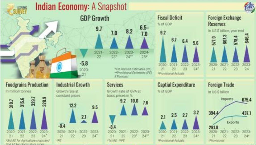 The Economic Survey says that India’s economy showed resilience to a gamut of global and external challenges as real GDP grew by 8.2 percent in FY 24, exceeding 8 percent mark in three out of four quarters of FY 24, driven by stable consumption demand and steadily improving investment demand.