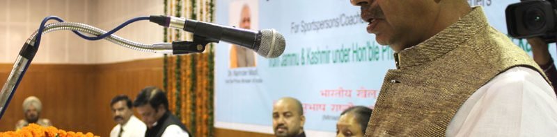 The Minister of State for Youth Affairs and Sports (I/C), Water Resources, River Development and Ganga Rejuvenation, Shri Vijay Goel addressing the gathering at the inauguration of the eight-week Special Certificate Course in Sports Coaching for Jammu & Kashmir sportspersons, at SAI NSNIS, in Patiala on November 02, 2016.