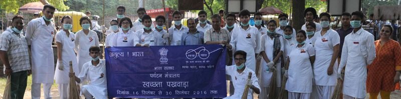 Officials, staff and students from the Ministry of Tourism’s institutions undertaking symbolic cleaning at Qutub Minar Delhi, to observe cleanliness related theme based fortnight (Pakhwada) from 16th to 30th September, in New Delhi on September 22, 2016