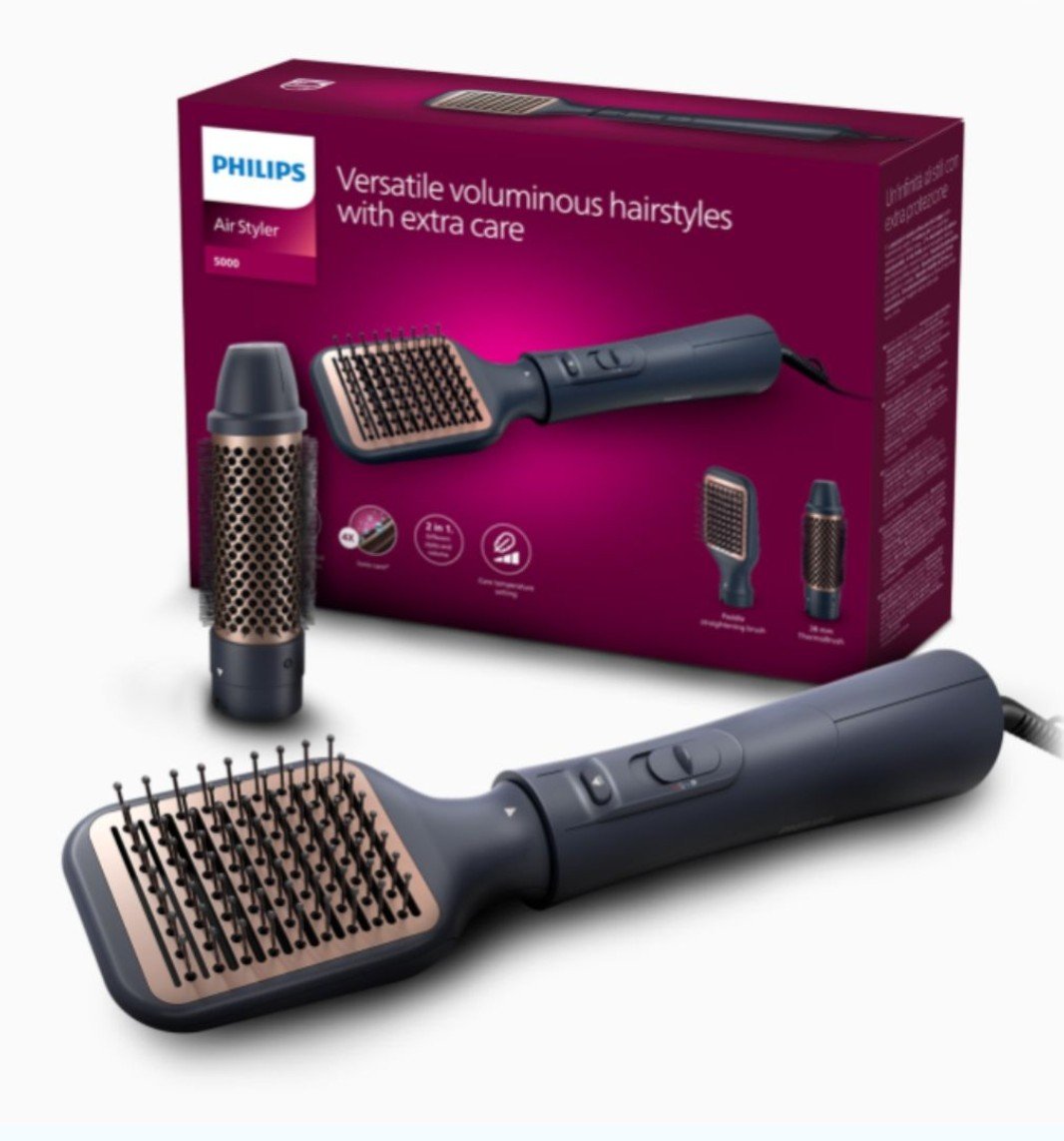 Featuring advanced Even Heat Distribution technology, argan oil-infused ceramic plates, and 4x ionic conditioning, the Philips 2-in-1 Airstyler helps women achieve beautifully styled, voluminous hair with up to 3x more volume while minimizing hair breakage by 50%. [1]The versatile design includes a paddle brush for a naturally straight, voluminous look, and a 38mm round brush for creating effortlessly relaxed waves. With this game changing tool, Philips makes salon-style blow drying simpler and more convenient, while ensuring the perfect care and protection for hair.