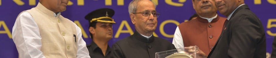Shri K V Brahmaji Rao, Executive Director, PNB, receiving Rajbhasha Kirti Shield from his Excellency, Shri Pranab Mukherjee, Hon’ble President of India at Vigyan Bhawan, New Delhi. Sh. Rajnath Singh, Hon’ble Home Minister, Sh. Haribhai Parathibhai Chaudhary, Minister of State for Home Affairs are also seen in the picture.