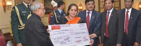 Usha Ananthasubremanian, MD & CEO, Punjab National Bank presented a cheque to President, Pranab Mukherji at Rashtrapati Bhawan as a helping hand towards eradication of leprosy. Gauri Shankar, K V Brahmaji Rao and Dr. R S Sangapure, Executive Directors were also present on the occasion along with the executives of Hind Kushth Nivaran Sangh.