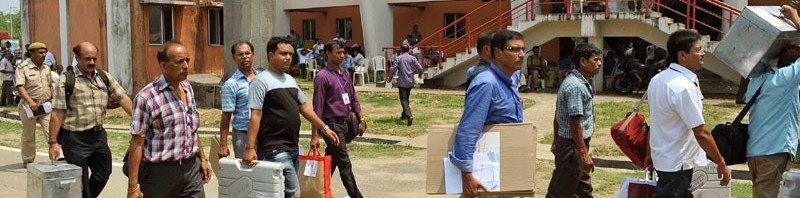 Polling officials carrying the Electronic Voting Machines (EVMs) and other necessary belongings for use in the General Assembly Elections, at Sarusaghai, Guwahati, in Assam on April 10, 2016.