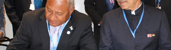The Prime Minister of Fiji, Mr. Frank Bainimarama signing the Framework Agreement of the International Solar Alliance, in the presence of the Minister of State for Environment, Forest and Climate Change (Independent Charge), Shri Anil Madhav Dave, at the India Pavilion at COP 22, in Marrakech, Morocco on November 16, 2016.