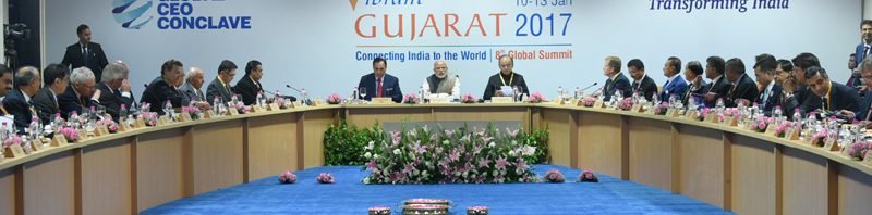 The Prime Minister, Shri Narendra Modi at the Global CEOs Conclave, at the Vibrant Gujarat Global Summit 2017, at Mahatma Mandir, in Gandhinagar, Gujarat on January 10, 2017. The Union Minister for Finance and Corporate Affairs, Shri Arun Jaitley and the Chief Minister of Gujarat, Shri Vijay Rupani are also seen.