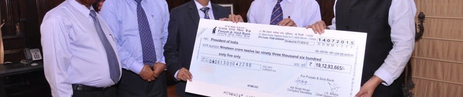 New Delhi: Punjab & Sind Bank paid Rs.19.12 crore as Dividend for the financial year 2014-15 to the Government of India. Sh.Jatinderbir Singh,IAS,Chairman & Managing Director of the Bank, presented a cheque of the dividend amount to Sh. Arun Jaitley,Hon’ble Finance Minister of India at New Delhi.