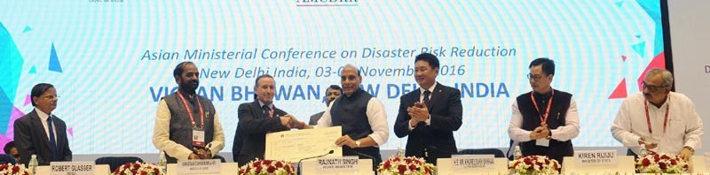 The Union Home Minister, Shri Rajnath Singh at the closing ceremony of the Asian Ministerial Conference for Disaster Risk Reduction (AMCDRR) 2016, in New Delhi on November 05, 2016. The Ministers of State for Home Affairs, Shri Hansraj Gangaram Ahir & Shri Kiren Rijiju, the Additional Principal Secretary to the Prime Minister, Dr. P.K. Mishra and the Union Home Secretary, Shri Rajiv Mehrishi are also seen.