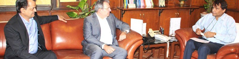 The CEO, HMS Host International, Mr. Walter Sieb and the Director, Lite Bite Foods (P) Ltd., Shri Rohit Aggarwal calling on the Union Minister for Railways, Shri Suresh Prabhakar Prabhu, in New Delhi on March 01, 2016.