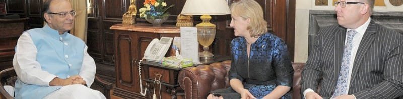 The Minister for Justice, Courts, Communications & Broadcasting, New Zealand, Ms. Amy Adams meeting the Union Minister for Finance, Corporate Affairs and Information & Broadcasting, Shri Arun Jaitley, in New Delhi on September 22, 2015.