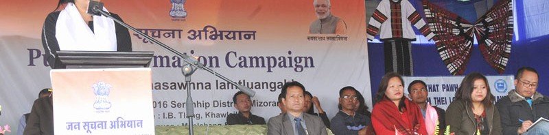 The MLA and Chairperson Mizoram Women Commission, Ms. Vanlalawmpuii Chawngthu addressing the gathering, at the Public Information Campaign, organised by the PIB, Aizawl, at Khawlailung, model village under SAGY on January 29, 2016.