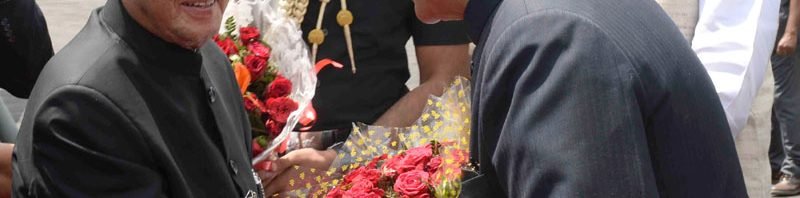 The President, Shri Pranab Mukherjee being welcomed by the Governor of Himachal Pradesh, Shri Acharya Devvrat and the Chief Minister of Himachal Pradesh, Shri Virbhadra Singh, on his arrival, at Kalyani Helipad, Mashobra, in Shimla on June 02, 2016.