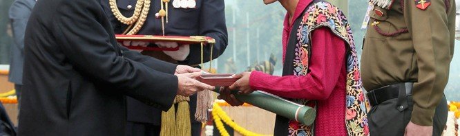 The President, Shri Pranab Mukherjee giving away the highest gallantry award Ashok Chakra to Lance Naik Mohan Nath Goswami of 9 Para (Special Forces) posthumously, the award received by his wife Smt. Bhawana Goswami, on the occasion of the 67th Republic Day Parade 2016, in New Delhi on January 26, 2016.