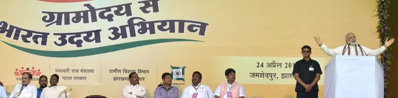 The Prime Minister, Shri Narendra Modi addressing at the Panchayati Raj Sammelan marking Panchayati Raj Day and concluding session of Gram Uday se Bharat Uday programme, in Jamshedpur, Jharkhand on April 24, 2016. The Governor of Jharkhand, Smt. Draupadi Murmu, the Union Minister for Rural Development, Panchayati Raj, Drinking Water and Sanitation, Shri Chaudhary Birender Singh, the Chief Minister of Jharkhand, Shri Raghubar Das, the Minister of State for Panchayati Raj, Shri Nihalchand and other dignitaries are also seen.