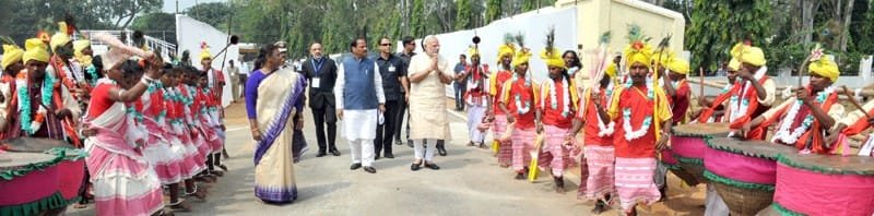 The Prime Minister, Shri Narendra Modi being welcomed by the Tribal/Folk dance artistes, at Khunti, in Jharkhand on October 02, 2015. The Governor of Jharkhand, Smt. Draupadi Murmu and the Chief Minister of Jharkhand, Shri Raghubar Das are also seen