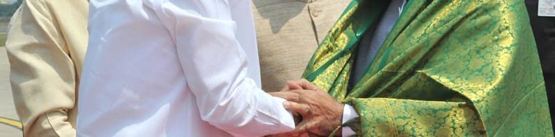 The Prime Minister, Shri Narendra Modi being welcomed on arrival by the Union Minister for Urban Development, Housing and Urban Poverty Alleviation and Parliamentary Affairs, Shri M. Venkaiah Naidu, the Governor of Andhra Pradesh and Telangana, Shri E.S.L. Narasimhan and the Chief Minister of Andhra Pradesh, Shri N. Chandrababu Naidu, at Gannavaram Airport, Andhra Pradesh on October 22, 2015.