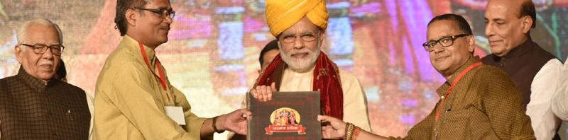 The Prime Minister, Shri Narendra Modi being welcomed on stage, at Aishbagh Ram Leela, in Lucknow, Uttar Pradesh on October 11, 2016. The Governor of Uttar Pradesh, Shri Ram Naik and the Union Home Minister, Shri Rajnath Singh are also seen.