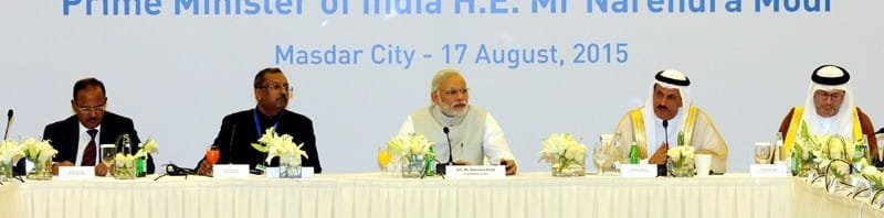The Prime Minister, Shri Narendra Modi discusses the investments and collaborations with the business leaders, at Masdar City, in Abu Dhabi, UAE on August 17, 2015.