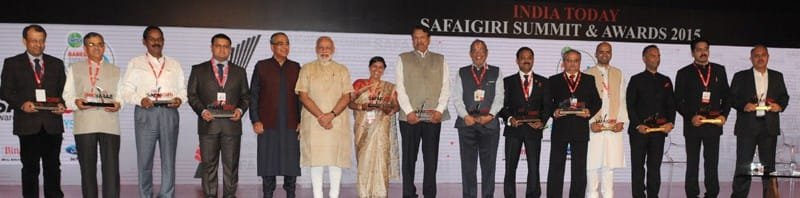 The Prime Minister, Shri Narendra Modi in a group photo with the winners of the Safaigiri Awards, at the Safaigiri Summit & Awards 2015, in New Delhi on October 02, 2015.
