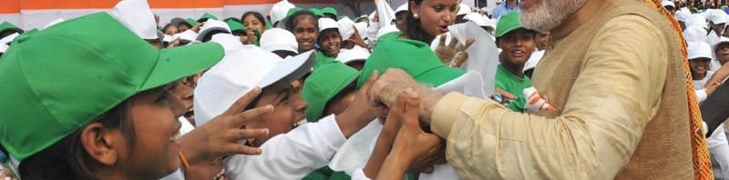 The Prime Minister, Shri Narendra Modi interacting with the school children after addressing the Nation on the occasion of 69th Independence Day from the ramparts of Red Fort, in Delhi on August 15, 2015.