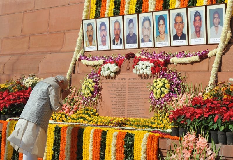 The Prime Minister, Shri Narendra Modi paying homage to the martyrs of 2001 Parliament attack,..