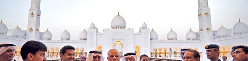 The Prime Minister, Shri Narendra Modi taking selfie with H.E. Sheikh Nahyan bin Mubarak Al Nahyan and H.E. Dr. Anwar Gargash at the Shiekh Zayed Grand Mosque, at Abu Dhabi, UAE on August 16, 2015