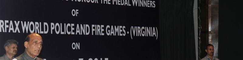 The Union Home Minister, Shri Rajnath Singh addressing at the felicitation ceremony of the Medal Winners at World Police & Fire Games-2015, Fairfax, Virginia, USA, in New Delhi on August 07, 2015. The Minister of State for Home Affairs, Shri Haribhai Parthibhai Chaudhary and other dignitaries are also seen.
