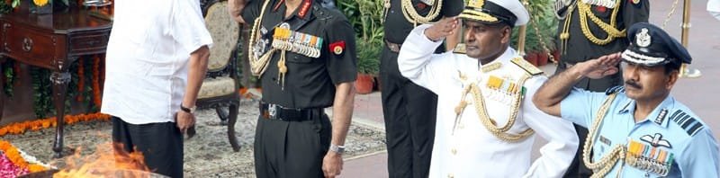 The Union Minister for Defence, Shri Manohar Parrikar accompanied by the Chief of Army Staff, General Dalbir Singh, the Chief of the Air Staff, Air Chief Marshal Arup Raha and the VCNS Vice Admiral P. Murugesan laid wreath, at Amar Jawan Jyoti, on the occasion of Kargil Vijay Diwas, in New Delhi on July 26, 2015.
