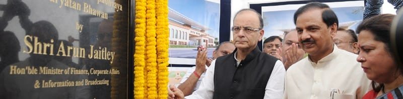 The Union Minister for Finance, Corporate Affairs and Information & Broadcasting, Shri Arun Jaitley unveiling the plaque to lay the foundation stone of the new building of Tourism Ministry “Paryatan Bhawan”, on the occasion of the World Tourism Day, in New Delhi on September 26, 2015. The Minister of State for Culture (Independent Charge), Tourism (Independent Charge) and Civil Aviation, Dr. Mahesh Sharma is also seen.