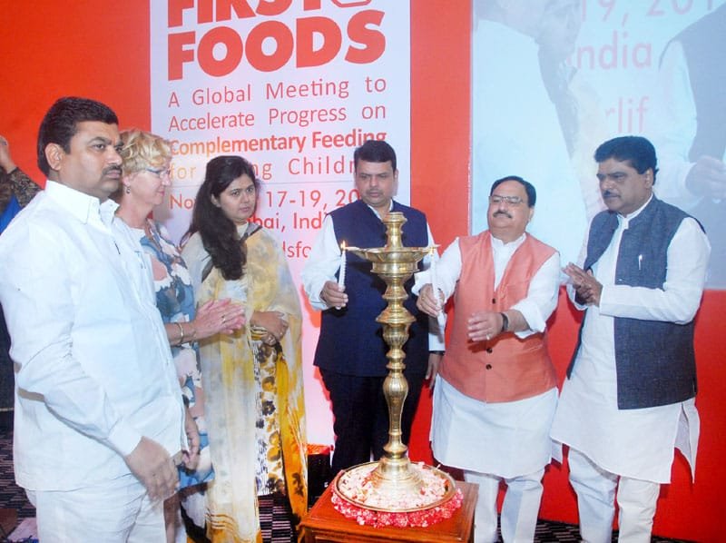 The Union Minister for Health & Family Welfare, Shri J.P. Nadda lighting the lamp to inaugurate the “Global meeting to Accelerate Progress on Complementary Feeding for Young Children”, in Mumbai on November 17, 2015. The Chief Minister of Maharashtra, Shri Devendra Fadnavis and other dignitaries are also seen