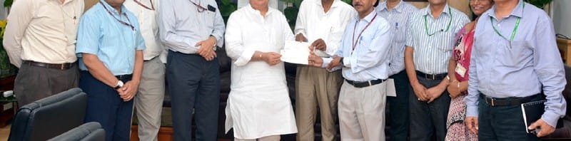 The Union Minister for Health & Family Welfare, Shri J.P. Nadda receiving a cheque of Rs. 20 lakh for Nepal earthquake victim from Dr. A.K. Gadpayle, Medical Superintendent, Dr. Ram Manohar Lohiya Hospital, New Delhi on August 10, 2015. The Secretary, Ministry of Health and Family Welfare, Shri B.P. Sharma and other dignitaries are also seen.