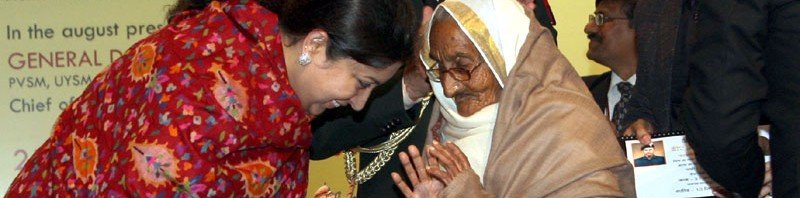 The Union Minister for Human Resource Development, Smt. Smriti Irani felicitating the widow of Paramveer Chakra awardee and the Hero of 1965 War, Havildar Abdul Hamid, at the release of the illustrated books for children on Paramveer Chakra awardees, on the eve of Republic Day, in New Delhi on January 25, 2016. The Chief of Army Staff, General Dalbir Singh is also seen.