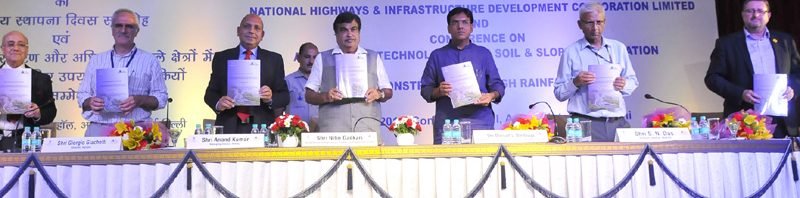 The Union Minister for Road Transport & Highways and Shipping, Shri Nitin Gadkari releasing the publication at the Second Inception Day Celebrations of the National Highways Infrastructure Development Corporation Ltd. (NHIDCL) and Conference on the Appropriate Technologies for Soil and Slope Stabilization and Road Construction in High Rainfall areas, in New Delhi on July 26, 2016. The Minister of State for Road Transport & Highways, Shipping and Chemicals & Fertilizers, Shri Mansukh L. Mandaviya and other dignitaries are also seen.