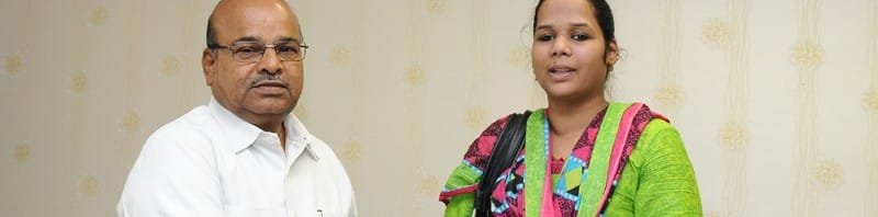 The Union Minister for Social Justice and Empowerment, Shri Thaawar Chand Gehlot presenting a cheque to Ms. Rabia Khan, National Awardee for attending International Braille Quran Conference at Istanbul, Turkey, in New Delhi on August 10, 2015