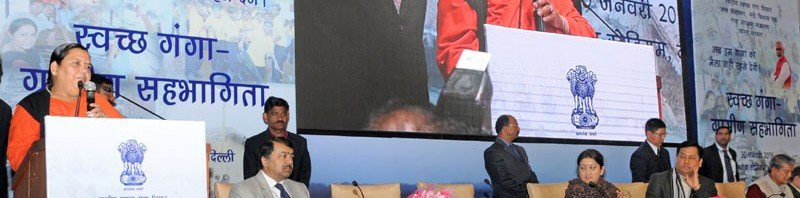 The Union Minister for Water Resources, River Development and Ganga Rejuvenation, Sushri Uma Bharti addressing at the inauguration of the National convention on Swachh Ganga – Gramin Sahbhagita, in New Delhi on January 30, 2016. The Union Minister for Human Resource Development, Smt. Smriti Irani, the Chief Minister of Uttarakhand, Shri Harish Rawat, Minister of State for Youth Affairs and Sports (Independent Charge), Shri Sarbananda Sonowal and the Secretary, Ministry of Water Resources, River Development and Ganga Rejuvenation, Shashi Shekhar are also seen.