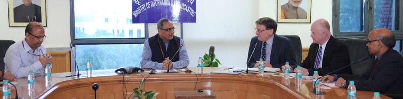 The Vice Chancellor of Queensland University of Technology, Brisbane, Australia, Prof. Peter Coaldrake meeting the Secretary, Ministry of Information and Broadcasting, Shri Bimal Julka, in New Delhi on August 17, 2015.