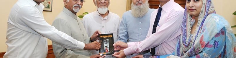 The Vice President, Shri Mohd. Hamid Ansari being presented a book entitled “The Sinless Victim”, authored by Mohammd Yaseer Abbasi, in New Delhi on August 19, 2015.