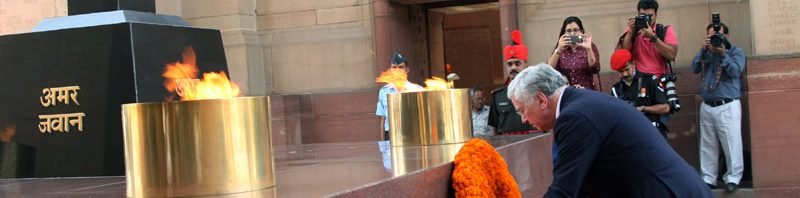 The UK Secretary of State for Defence, Sir Michael Fallon laying wreath at Amar Jawan Jyoti, ..